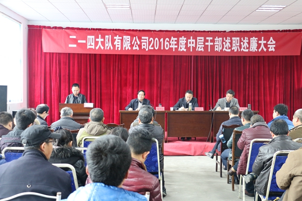 2017年1月6日下午,二一四大隊有限公司在城固召開了2016年度全體中層干部述職述廉及民主測評大會。公司全體班子成員、中層干部、城固機關工作人員和各經營單位在隊人員共81人參加了大會,會議由紀委書記、工會主席楊乃讓主持,公司總經理田社生、黨委書記李新平在會上作了重要講話。