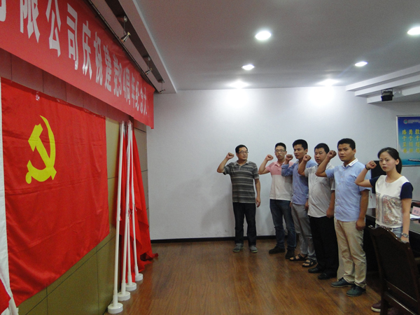 然后舉行了莊嚴的新黨員入黨宣誓儀式,在黨群監審部部長華崢帶領下,新入黨的劉歡、張文斌、高政偉、程博興、石福旭五位同志和與會的所有老黨員、入黨積極分子一起在黨旗下莊嚴宣誓,新黨員代表高政偉做了表態發言。