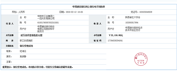 自新型冠狀病毒肺炎疫情發(fā)生以來,公司快速成立工作領(lǐng)導(dǎo)小組,全力貫徹落實(shí)習(xí)近平總書記重要指示和中央精神及集團(tuán)黨委的部署,全面做好疫情防控工作。在公司黨委的號(hào)召下,各黨支部積極響應(yīng)通過QQ及微信工作群迅速組織黨員干部和職工進(jìn)行抗疫捐款,由于疫情當(dāng)前不能集中組織開展現(xiàn)場(chǎng)活動(dòng),所有職工都直接通過微信、支付寶、手機(jī)銀行等轉(zhuǎn)賬的方式進(jìn)行了捐款,通知一發(fā)出,一份份包含愛心的捐款接連不斷,僅僅在短短的2個(gè)小時(shí)內(nèi)共有165名干部職工踴躍捐款23150元,公司已通過銀行轉(zhuǎn)賬方式將捐款轉(zhuǎn)至陜西省紅十字會(huì)賬戶。
