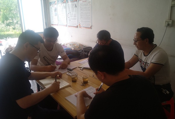 現場檢查結束后回到項目部,項目負責人張源首先對項目進展情況及主要成果等方面做了詳細匯報,余鋼就項目運作和管理方面作了補充匯報,安全員王遠海對項目安全管理體系做了介紹。在認真聽取匯報后,王義忠從野外實際調查資料的完整程度、資料編制的規范情況及合同約定履行進度方面進行了綜合檢查評述,并針對項目在開展過程中存在的問題進行了指導,提出了指導性意見及建議。涂宏對項目質量管理體系資料做了認真檢查,并對存在的問題進行了指正。
