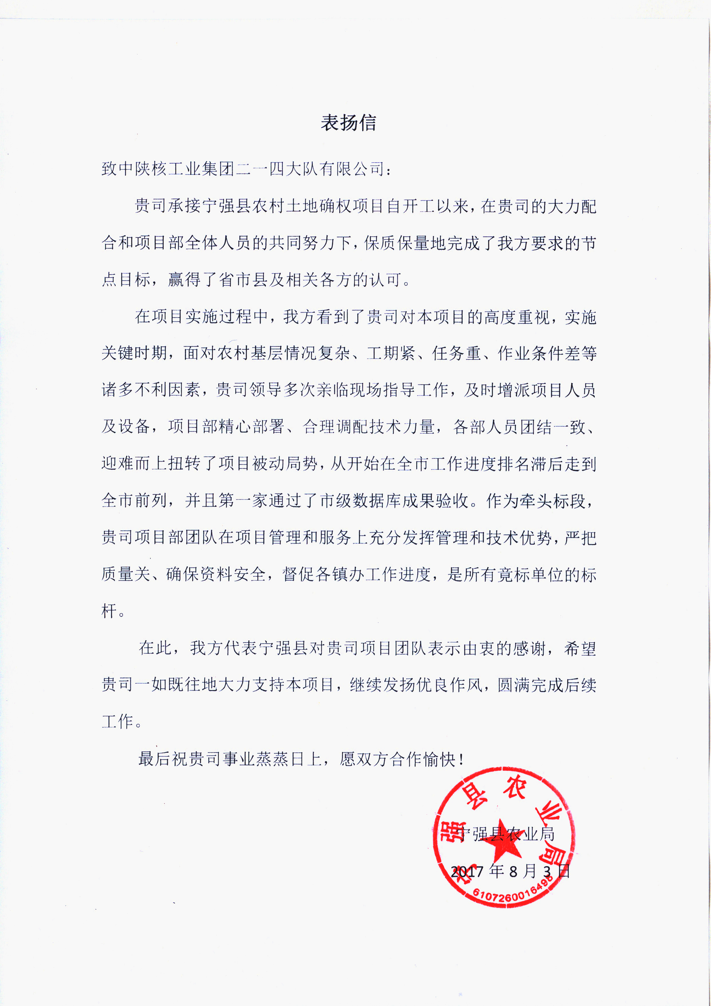 8月3日,公司收到寧強縣農業局的表揚信,稱贊公司領導多次親臨現場指導,精心部署,增派技術人員。項目部人員團結一致、迎難而上扭轉了項目被動局面,使寧強縣土地確權工作進度從漢中市排名滯后走到全市前列,成為第一家通過了市級數據成果驗收,是所有競標單位的標桿。