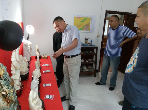就漢白玉開發(fā)和利用,項(xiàng)目組加工制作了漢白玉工藝品,田社生仔細(xì)的觀察每一件擺件,并不時的拿出玉石手電筒照看,查看玉雕件的透度,并與在場的項(xiàng)目組人員交流,詳細(xì)的詢問了漢白玉礦體的有關(guān)情況。
