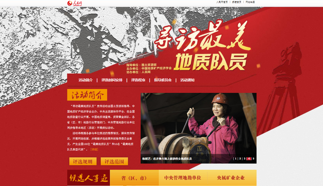 由國(guó)土資源部指導(dǎo),中國(guó)地質(zhì)礦產(chǎn)經(jīng)濟(jì)學(xué)會(huì)主辦,組織廣大新聞媒體開展“尋訪最美地質(zhì)隊(duì)員”大型宣傳活動(dòng),在全國(guó)地質(zhì)勘查行業(yè)開展,通過(guò)自下而上推選、網(wǎng)絡(luò)初選、專家評(píng)選方式,最終評(píng)選出100名“最美地質(zhì)隊(duì)員”和10名“最美地質(zhì)隊(duì)員典型代表”。