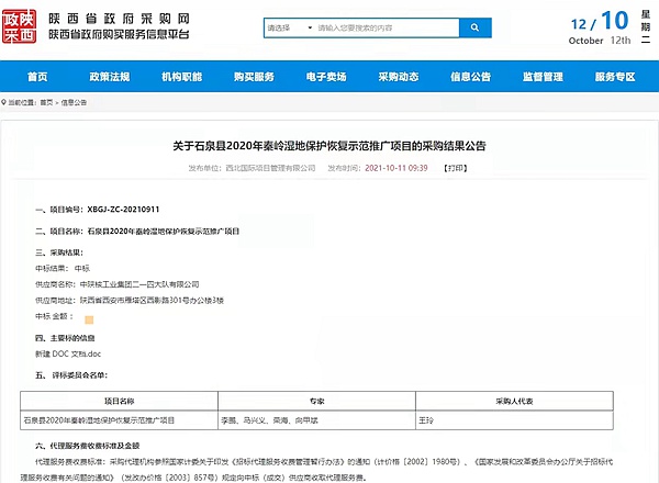 10月11日,陜西省政府采購網公示,公司成功中標石泉縣2020年秦嶺濕地保護恢復示范推廣項目。